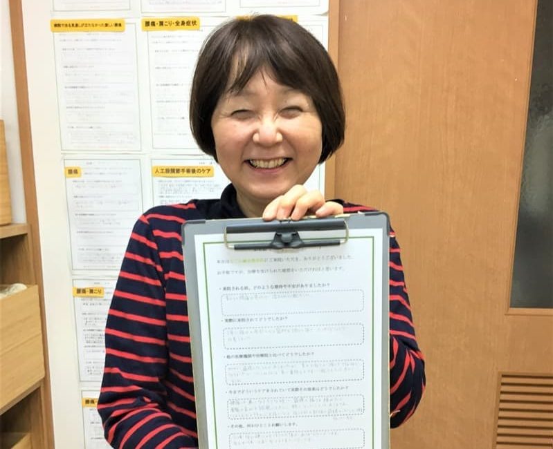 もともと仕事や家事で腰が痛くなってしまい、どこに行っても良くならず途方に暮れていました。整形外科のレントゲンでは特に異常なし(年相応だと言われ)、整体でもその時は良いのですが改善しない状態でした。