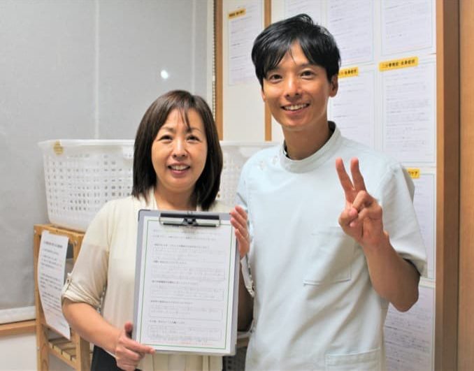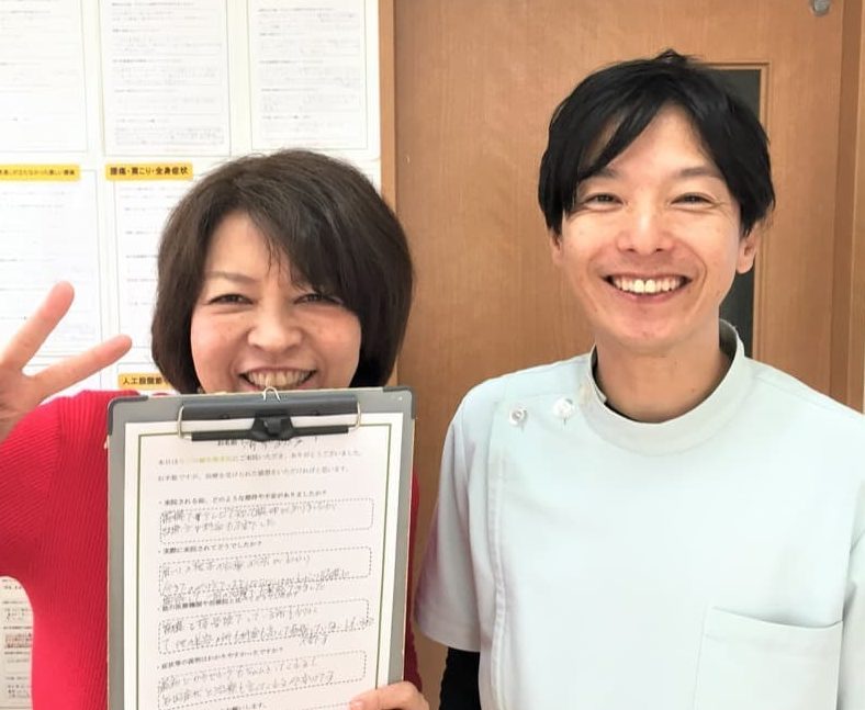 もともとは首が痛くて回らなくなった事がキッカケで来院したのですが、今までにない程の痛みだったので自分でもどうしようもなく旦那さんに車で送ってもらい来院しました。全く動かせず横になるのも一苦労の中で施術して頂き6回程でかなり改善しました。