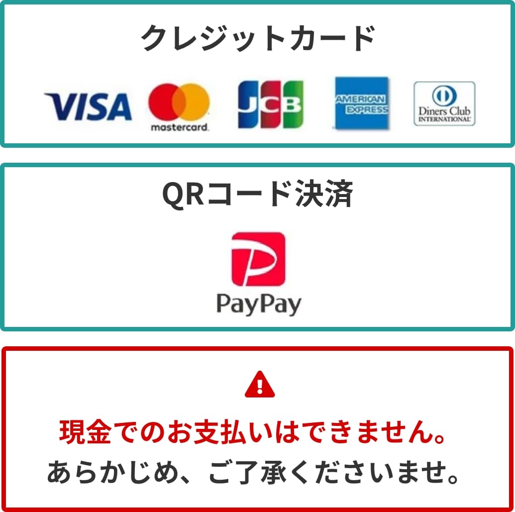 現金でのお支払いは承っておりませんので、あらかじめご了承ください。